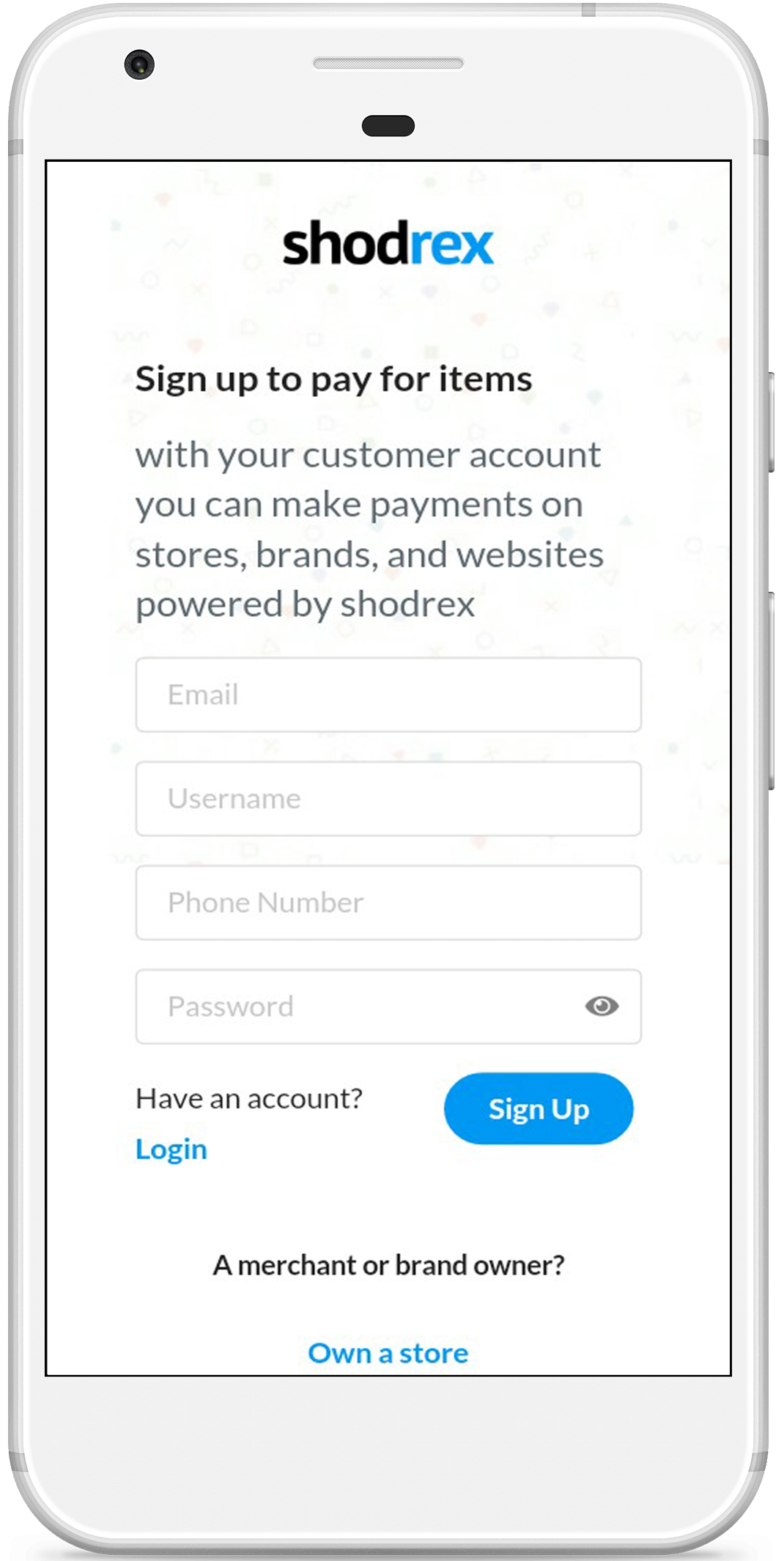 If you are a merchant or brand owner click on Get started to learn to how start using Shodrex to setup your business, or continue on this page if you are a buyer or customer. A customer account would contain the user's info such as e-mail address, phone number, address, etc. So that a merchant can easily identify you and deliver goods to the address.